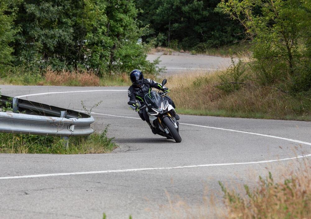 La posizione in sella è naturale: al manubrio rialzato fanno da contraltare le pedane che restano sportive e relativamente rialzate, per garantire una buona luce a terra e supportare gli spostamenti del corpo nella guida sportiva. Si siede comodi e anche su percorrenze autostradali di una certa distanza - diciamo fra un rifornimento e l’altro - non si avvertono anchilosamenti o carichi particolari. E quando si guida fra le curve, si è nelle condizioni perfette per gustarsi la dinamica e tenere un ritmo elevatissimo con davvero poca fatica.