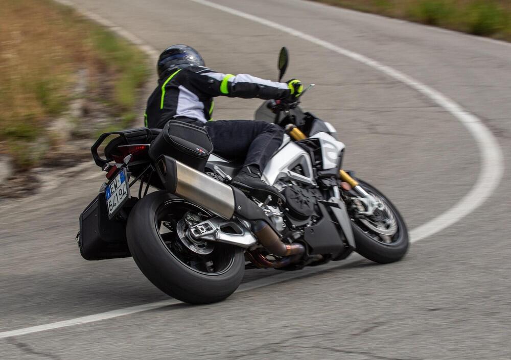 Capitolo turismo e uso quotidiano: avremmo preferito una soluzione più capiente per le valige, che oltretutto sembrano un po’ posticce. Certo, stiamo parlando comunque di una sportiva, ma l’aftermarket sa fare di meglio e dalla soluzione proposta dalla casa ci aspettiamo di più. Quasi nulla da segnalare invece nell’impiego cittadino, dove la Tuono V4 sguscia bene nel traffico. Anche se, come potete immaginare, servono gambe d’amianto per resistere al calore sprigionato al semaforo dal suo motore. La concorrenza, del resto, non è messa meglio…