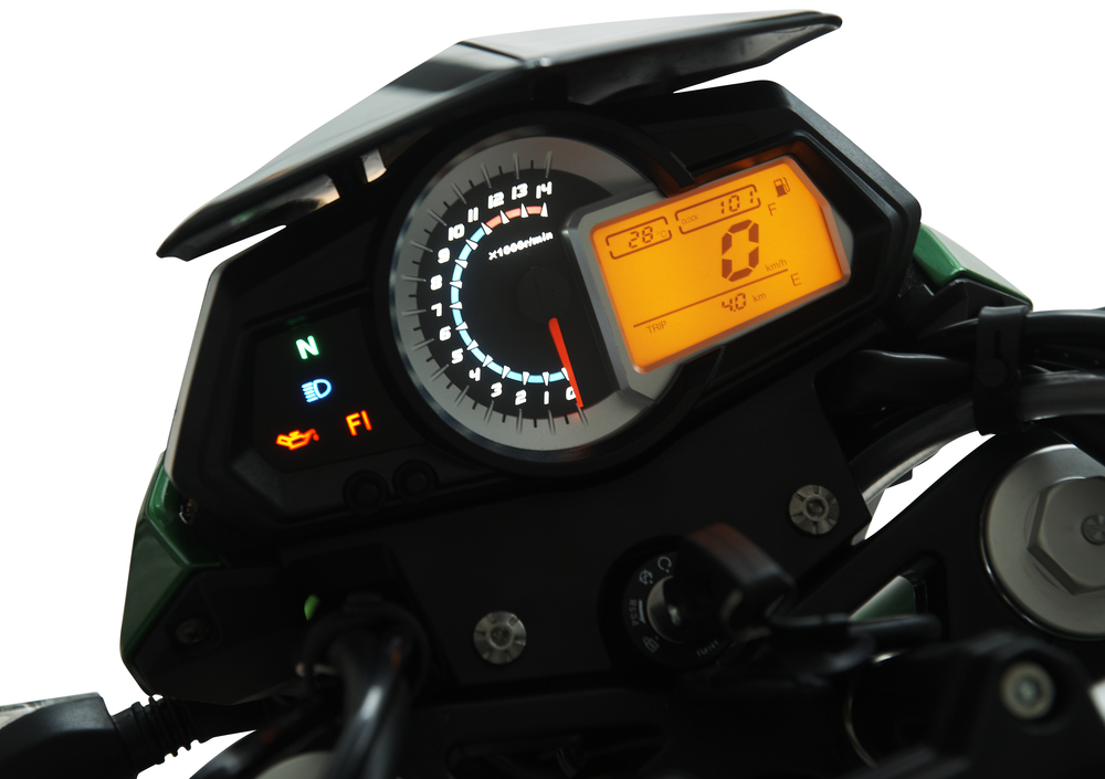 La strumentazione è minimalista, velocità e temperatura sono segnalate da uno strumento digitale insieme al livello della benzina, mentre non è disponibile l'indicatore della marcia inserita. Il contagiri è invece di tipo analogico.