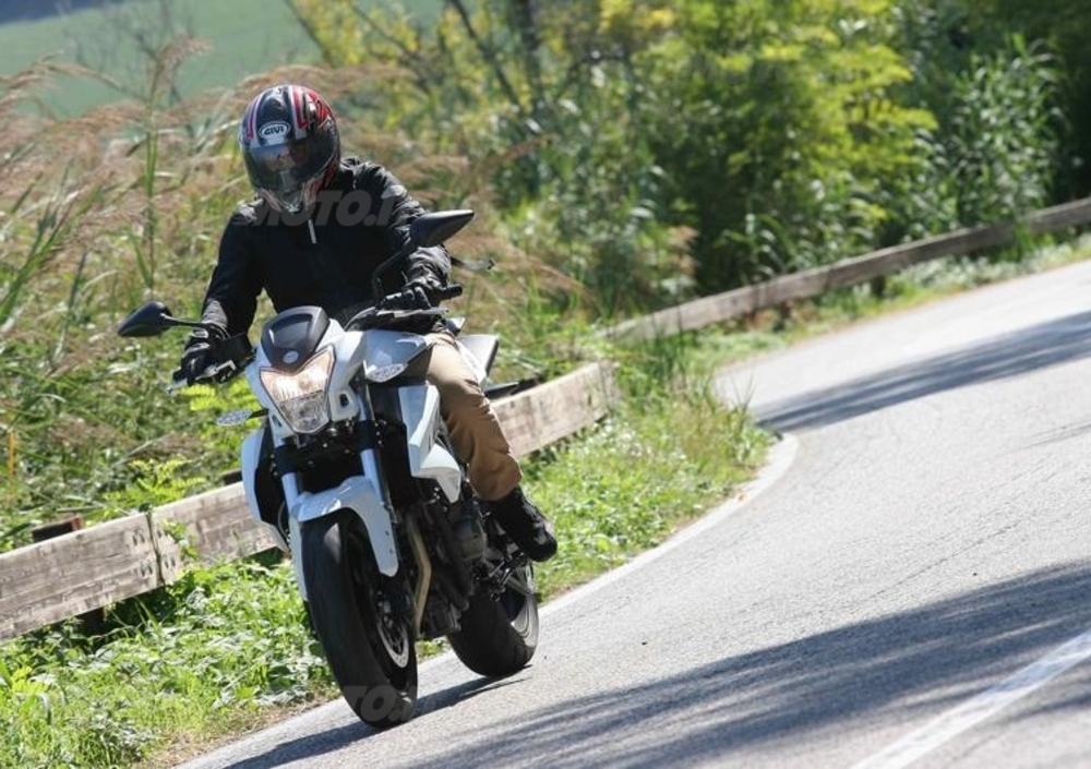 Per schizzare via serve strapazzarlo: ma ce n’è davvero bisogno? Complice la giornata ancora estiva, ce ne siamo andati in giro ad andatura (quasi) Codice per i dolci rilievi che circondano Pesaro, accompagnati dal cupo e gradevole tono emesso dagli scarichi, apprezzando funzionalità e precisione del cambio (ma non sarebbe male una rapportatura più distesa) e apprezzando l'impianto frenante. Strade di collina, purtroppo non sempre dall’asfalto impeccabile: chiamate all’opera, le sospensioni ci sono parse confortevoli ma migliorabili nella forcella, in certi frangenti troppo morbida nell’unica taratura disponibile. Assolutamente priva d’ogni protezione aerodinamica, la BN 600R consente comunque di andare a 130 orari senza affanni particolari, con impatto gestibile sul busto ed impegno non eccessivo per le braccia. Con l’aumento del regime di rotazione, a partire dai 6.500 giri, si manifestano vibrazioni sul manubrio, più evidenti con l’avvicinarsi della zona rossa: nulla di insopportabile, ma alla lunga possono provocare qualche fastidio.