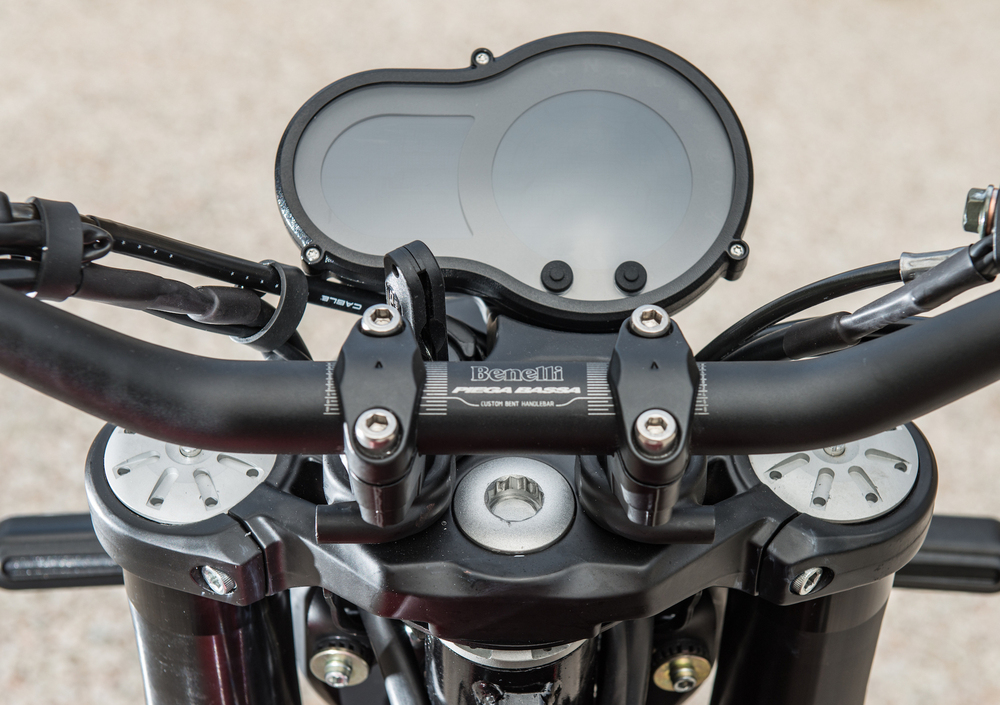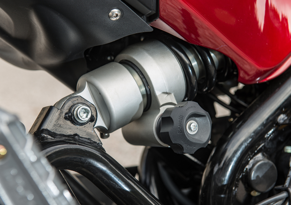 Il propulsore è incastonato in un telaio a traliccio in acciaio, stesso materiale e medesima struttura per il forcellone, al quale è “ancorato” un mono posizionato quasi orizzontalmente sul lato destro, regolabile nell’estensione agendo su di un registro raggiungibile smontando il fianchetto sullo stesso lato, e nel precarico molla con un pratico pomello. Davanti troviamo una forcella a steli rovesciati da 50 mm di diametro made in Benelli (come la sospensione posteriore), dotata di regolazione dell’estensione. Di costruzione propria anche l’impianto frenante, marchiato Benelli, che prevede due pinze a quattro pistoncini con attacco radiale per frenare i due dischi semi flottanti da 320 mm, e una pinza flottante a singolo pistoncino per il disco da 260 mm. L’ABS è stato sviluppato con Bosch ed è escludibile attraverso un pulsante dal posizionamento originale, sul braccialetto di fissaggio del retrovisore sinistro.