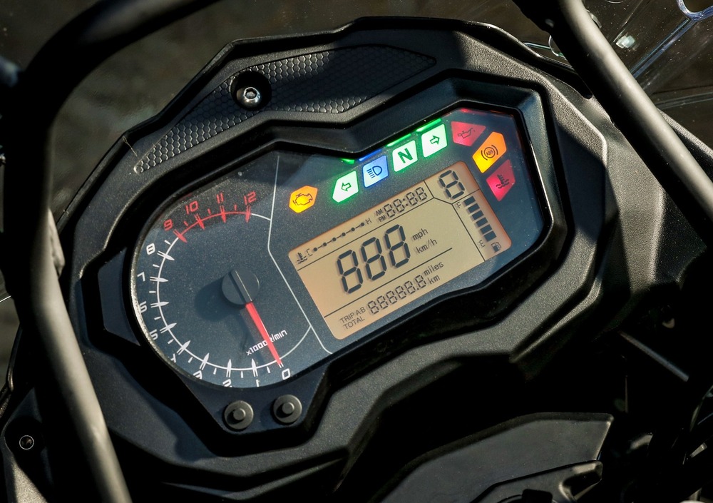 La strumentazione analogico/digitale è condivisa con la TRK 502: discretamente leggibile e ricca di info, visualizza sul display il tachimetro, due contachilometri parziali, livello carburante, temperatura del liquido di raffreddamento, orologio e rapporto inserito. Pratica, anche se non particolarmente attraente dal punto di vista estetico, la presa USB alloggiata sul lato sinistro della carena è certamente utile per l’alimentazione di eventuali accessori, navigatore o smartphone in primis.
