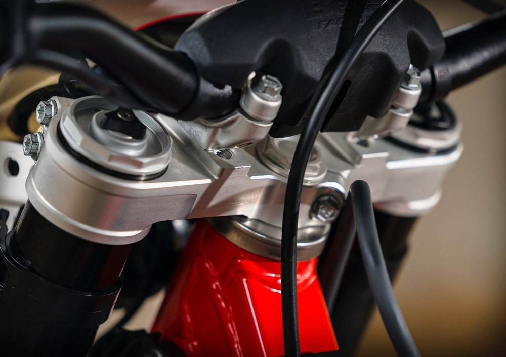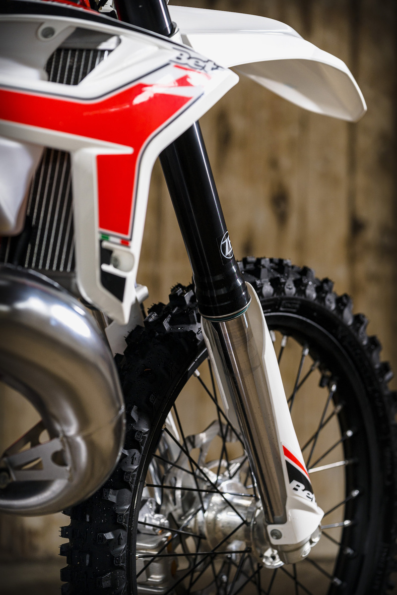 Nuova forcella, con cartuccia interna accorciata per minore volume d’olio, questo per ridurre peso ed aumentare la camera d’aria, che consente di ridurre l’effetto del cambio volume d’aria dovuto alle temperature. Aumenta quindi la finestra di lavoro per la taratura corretta per ogni cilindrata. Per il mono troviamo all’interno un sistema di battuta con contromolla, che elimina l’urto di tutto esteso e crea una sorta di effetto anti-saltellamento. Anche in fase di massima compressione troviamo un nuovo tampone più progressivo che riduce notevolmente l’effetto rimbalzo. Si completa l’aggiornamento con nuovi setting in virtù delle nuove rigidità dei telai.