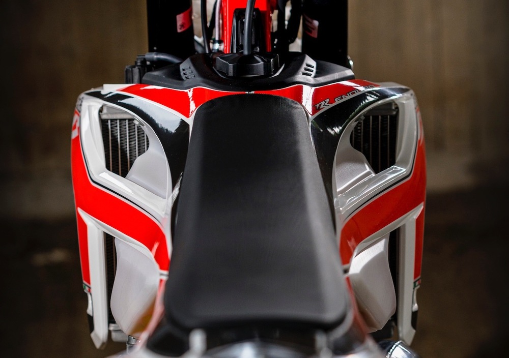In Beta hanno lavorato molto sulla forma del serbatoio e sulla linea della sella per avere una moto stretta, ma allo stesso tempo abbastanza costante senza avere un allargamento sui radiatori, consentendo un movimento in moto più spontaneo. Nuova anche la mascherina anteriore, molto vicina al manubrio, per avere una buona visione della ruota anteriore.