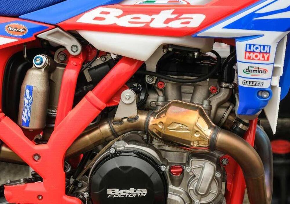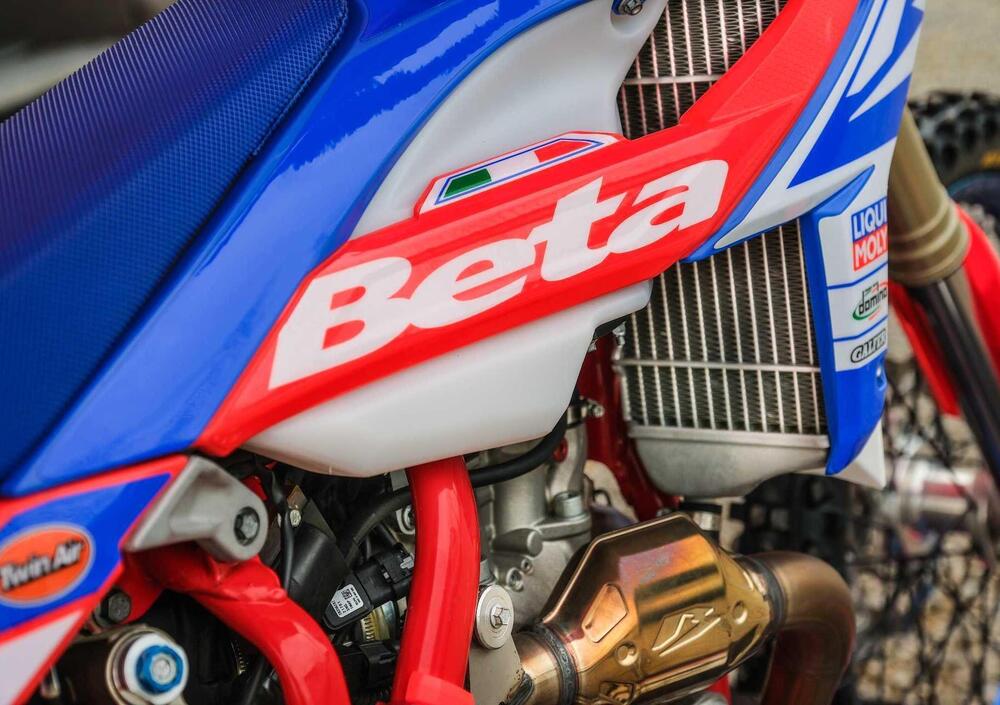 La posizione del motore così come i relativi attacchi sono diversi rispetto ai modelli enduro e consentono un ottimo bilanciamento, in curva, così come in salto. Telaietto posteriore e cassa filtro: RX 450 ha un nuovo telaietto posteriore in alluminio che, nonostante la sua leggerezza, dona rigidità al veicolo. Questa nuova componente si integra alla perfezione con la nuova cassa filtro, mai utilizzata prima sui modelli Beta. La nuova cassa filtro e i relativi manicotti, uniti al nuovo corpo farfallato da 46mm, determinano una portata d’aria nettamente diversa rispetto a quella richiesta da una moto da enduro e generano un flusso ottimale per alimentare le prestazioni del nuovo propulsore. L’accesso al filtro rimane sul fianco sinistro della moto, ed è estremamente facile ed intuitivo, oltre a non richiedere nessun tipo di attrezzo.