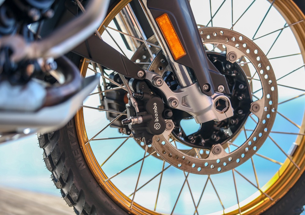 L’impianto frenante prevede un bidisco anteriore da 305 mm con pinze flottanti Brembo assiali a due pistoncini, e il disco posteriore da 265 mm. L’ABS, che può essere escluso per la guida fuoristrada, come ricordato diventa di tipo cornering acquistando il pacchetto Dynamic: con la mappa Enduro Pro, l’ABS è disattivato sulla ruota posteriore.