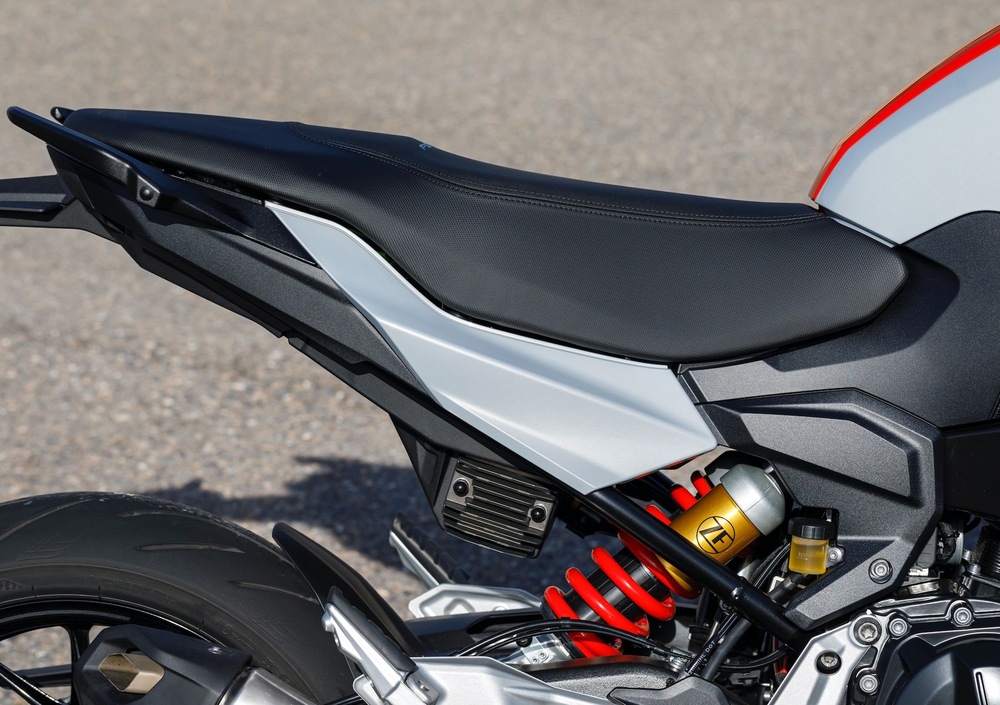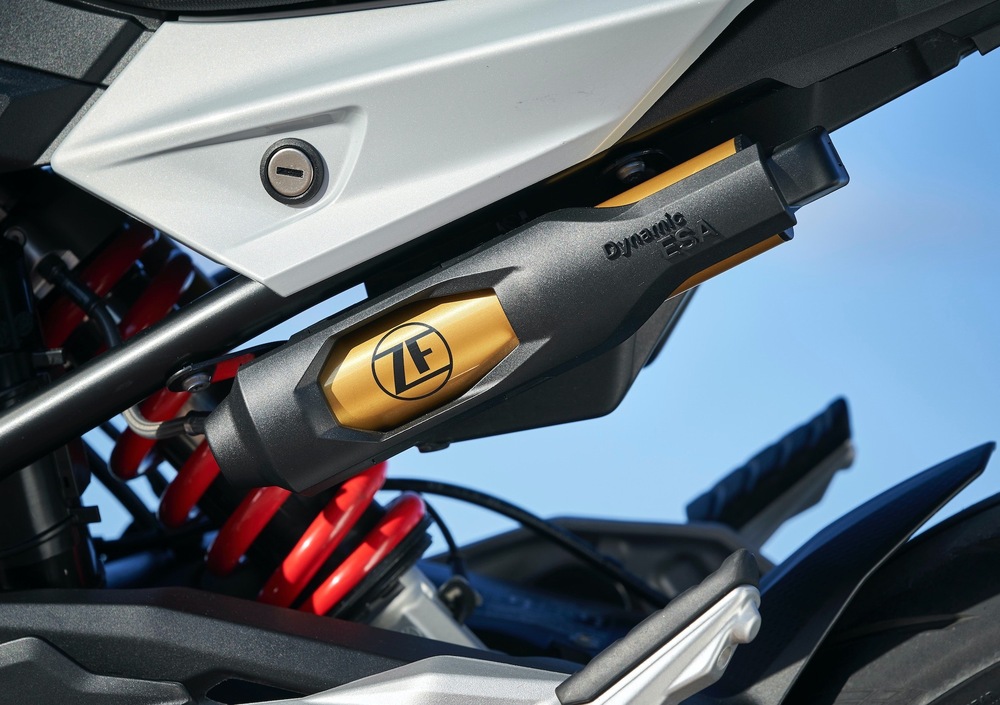 Le sospensioni - forcella teleidraulica rovesciata da 43 mm e monoammortizzatore posteriore regolabile nel precarico, se non si adotta l’optional Dynamic ESA, che introduce la funzionalità semiattiva al posteriore - hanno corsa più contenuta rispetto alla crossover, determinando un interasse contenuto in 1.518 mm.