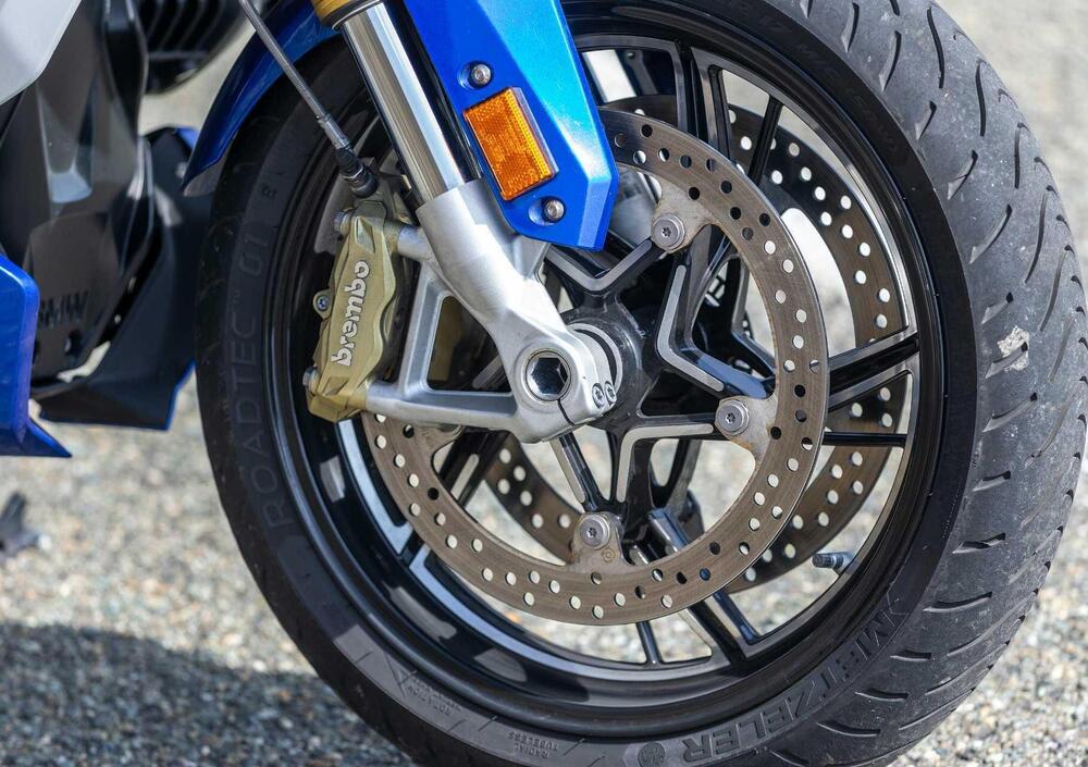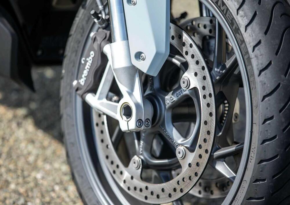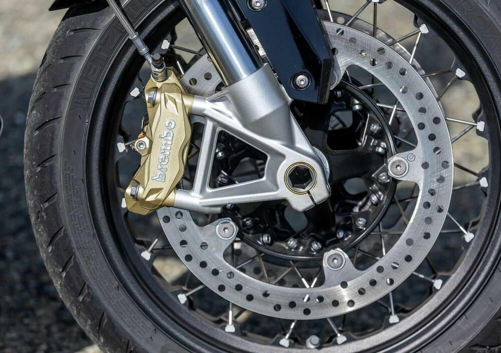 Condivisione anche per il freni: un doppio disco anteriore da 320 mm con pinze monoblocco radiali Brembo e un singolo disco da 276 mm al posteriore: cambia per il 2023 l'ABS, ora è di serie l'Integral ABS Pro, disinseribile, che lavora in modalità parzialmente integrale e cui si aggiunge il Dynamic Brake Control che evita l'attivazione involontaria dell'acceleratore.
