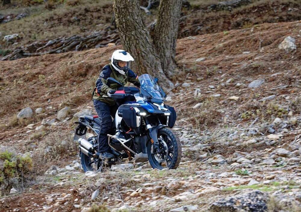 Un altro aspetto su cui BMW ha lavorato è il comfort. Rispetto alla GS, la seduta è più simile a quella della 1250 ma allo stesso tempo più stretta nella parte anteriore. C'è spazio per muoversi, l'imbottitura è ottimale. Da seduto le gambe sono un po' piegate perché le pedane sono leggermente arretrate ma, al netto che si possono anche regolare, sono nella posizione ideale quando guidiamo in piedi. Per chi scrive il manubrio è leggermente lontano, ma anche qui entra in gioco la personalizzazione. A livello di protezione aerodinamica busto e gambe non prendono praticamente aria. Con il parabrezza abbassato non ci sono flussi d'aria almeno fino ai 100 km/h e alzandolo al massimo non ci sono almeno fino ai 130 km/h (e sottolineiamo almeno...). Tuttavia le braccia sono inevitabilmente sempre esposte per via della posizione. Non abbiamo riscontrato turbolenze degne di nota ad andature autostradali nemmeno con il casco dotato di visierino. Invece dobbiamo segnalare qualche vibrazione, quella sì, sempre agli stessi regimi e specialmente sulle pedane ma, prima che vi preoccupiate, dobbiamo specificare che abbiamo guidato sempre senza gommini.