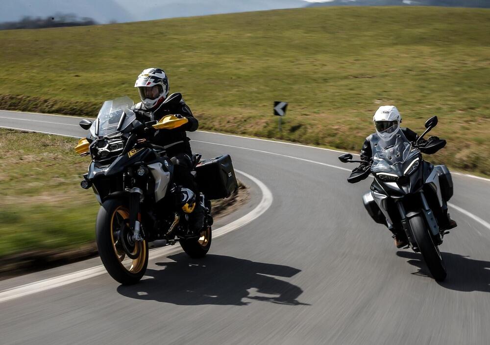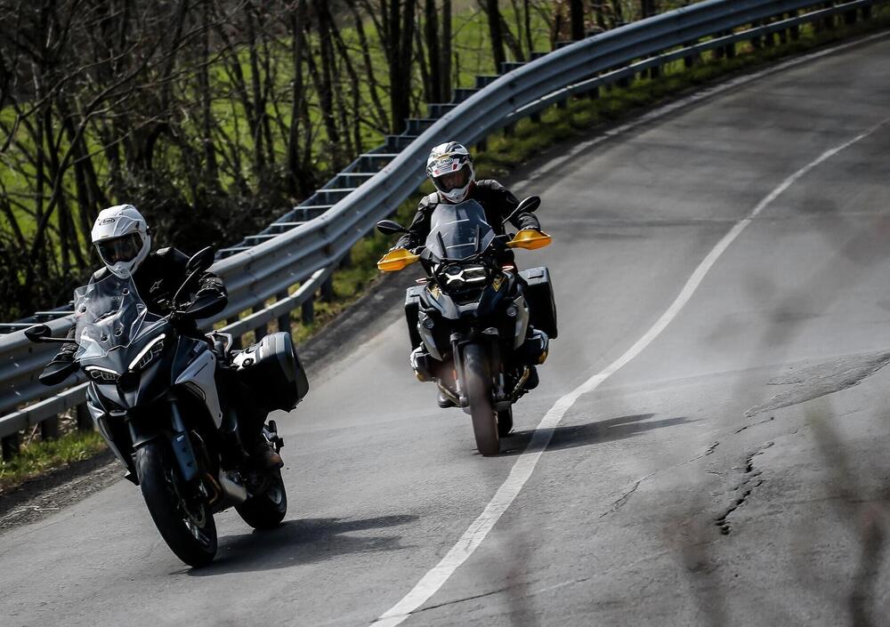 Viaggia forte anche lei, il motore è molto pronto nei sorpassi e nelle prove di ripresa dagli 80 km/h è vicinissima alla V4, che prende il là dopo i 200 km/h. Con la GS non serve scalare marcia praticamente mai. Ripara un filo meno a livello di cupolino.