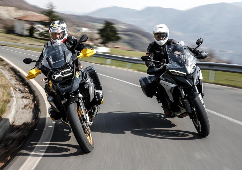 Una delle sfide più attese del 2021: da una parte la regina del mercato, la BMW R1250GS in versione Anniversario 40 anni, dall'altra la sfidante ipertecnologica col motore V4 e il radar, la Ducati Multistrada V4S. In questa prova, corredata dal video completo di 38 minuti (armatevi di pazienza e pop corn!) vi raccontiamo come vanno, diamo i voti nelle consuete pagelle e vi mostriamo prestazioni, pesi e consumi rilevati nel test (li trovate in fondo all'articolo per comodità). Buona visione e diteci nei commenti cosa ne pensate delle ammiraglie del segmento maxienduro, proposte da BMW e da Ducati.