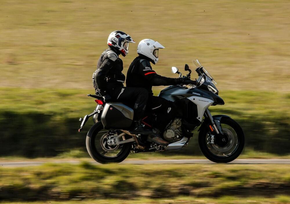 Di serie la Anniversario monta una sella Rally in singolo pezzo. La moto della prova ha invece la sella doppia, comodissima, e un parabrezza maggiorato. Il calore dal motore è ridottissimo, le vibrazioni si avvertono appena e la protezione dall'aria è appena inferiore rispetto alla Multistrada.