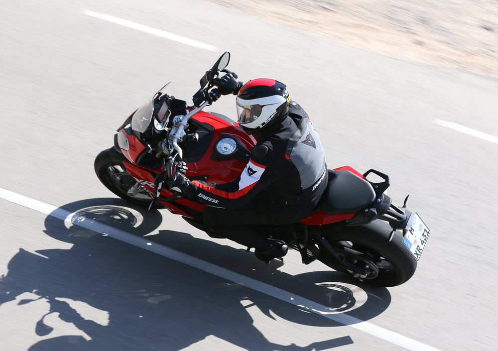 La maneggevolezza non manca, nonostante l'interasse, e il manubrio ampio dà una bella mano nel misto stretto. L'avantreno chiude bene e in una sincopata sequenza di svolte l'inerzia di sterzo è minima