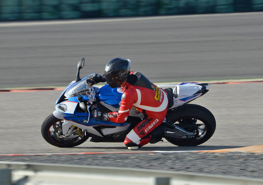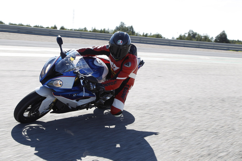 Il tracciato di Monteblanco, nella configurazione scelta dagli uomini della BMW (questa pista può variare disegno secondo le esigenze) è abbastanza tortuoso, con un allungo di tutto rispetto rappresentato dal rettilineo principale, dove si arrivano a leggere velocità massime tra i 280 e i 290 km/h. Lo stress per l’impianto frenante è notevole, e questo comporta anche un impegno notevole da parte del pilota. Una volta conosciuta la pista, proviamo a conoscere anche la nuova S 1000 RR, che sin dal primo approccio ci fa capire che per tirare fuori il meglio da lei, bisogna metterci tecnica e muscoli. Il motore è certamente più lineare nell’erogare l’immensa potenza di cui è dotato, ma 199 cv sono sempre tanti, elettronica a sovraintendere o no! Le velocità che riesce a raggiungere questa moto in spazi brevissimi, non consentono un attimo di pausa e la concentrazione deve essere sempre massima.
