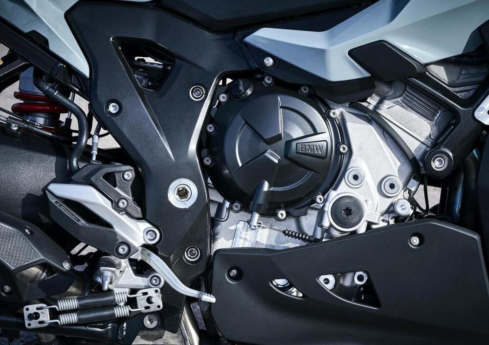 La BMW S1000XR 2020 mantiene la… discendenza diretta dalla Superbike di famiglia, ed è quindi spinta da un quadricilindrico in linea strettamente derivato dalla S1000RR, capace di 165 cavalli a 11.000 giri e 114 Newton/metro a 9.250 giri. Risultati notevoli, ottenuti anche senza fare ricorso al comando distribuzione a fasatura variabile Shiftcam, che qui non avrebbe portato alcun beneficio: a 9.000 giri la spinta è già tale da quasi imporre il passaggio al rapporto successivo, e la presenza di una seconda fasatura che aumentasse ulteriormente la spinta agli alti regimi non avrebbe davvero avuto senso.