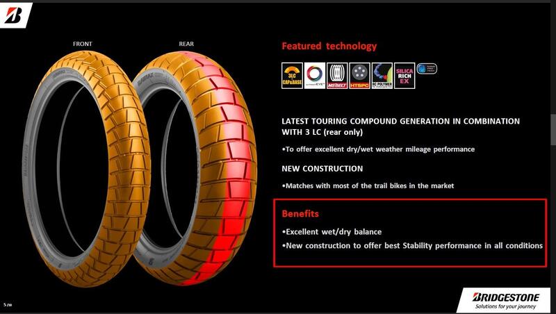L'AT41, hanno dichiarato i tecnici Bridgestone nella conferenza stampa, è quindi uno pneumatico destinato al 90% all'asfalto e per il 10% al fuoristrada, il cui look a tasselli è pensato per allinearsi al design adventure delle Maxienduro, esaltandolo; non sostituisce l'A41 che resta in gamma ma ne costituisce un addendum: rispetto a quest'ultimo vengono dichiarati un miglioramento delle performance sul bagnato grazie anche agli intagli presenti sulla gomma posteriore che permettono uno smaltimento del velo d'acqua superiore di 1,5 volte e al maggior volume medio degli intagli sull'area di contatto con l'asfalto. Per contro, nella classica spider chart (il grafico a tela di ragno) che paragona i due prodotti, si evidenzia un grip su asciutto appena inferiore all'A41, tuttavia il test – vi spoileriamo - non ha mai evidenziato carenze di grip su asfalto, anzi.