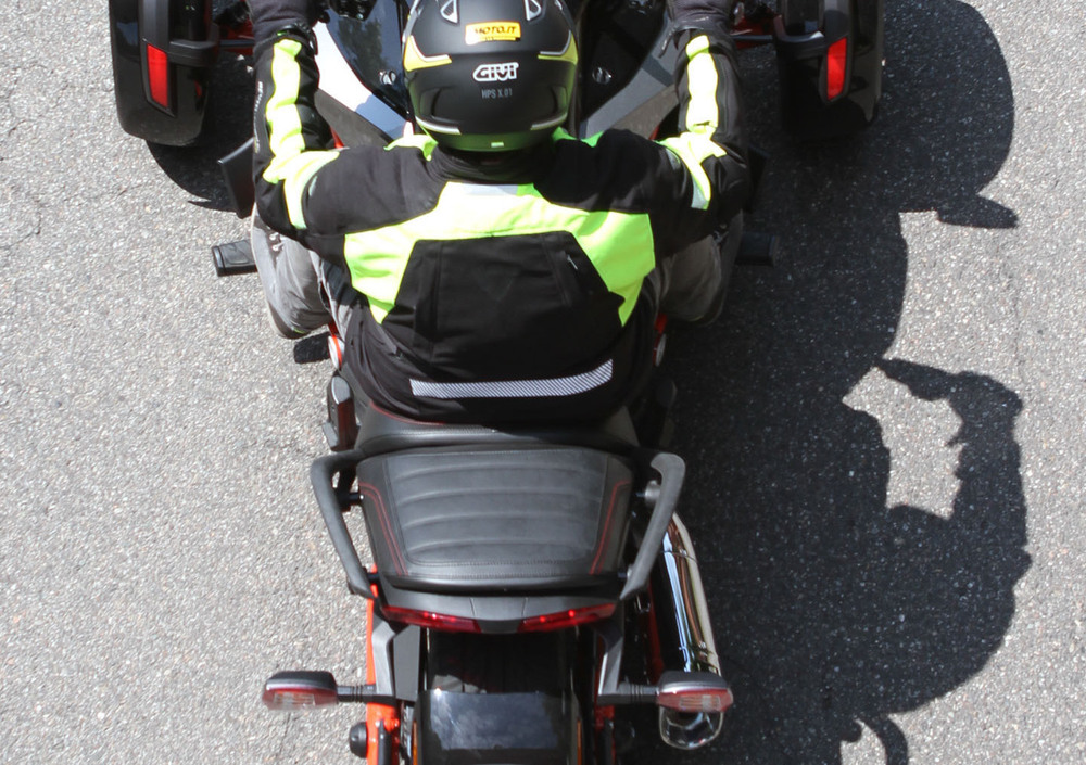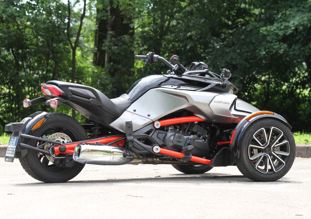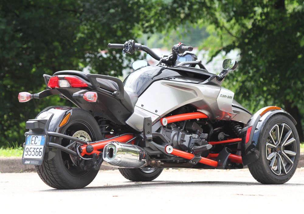 Ho percorso qualche centinaio di chilometri con lo Spyder, e devo dire che con la consuetudine l’ho apprezzato sempre più - chiaramente in relazione al tipo di mezzo, sia chiaro – soprattutto usandolo po’alla garibaldina, mettendolo alla frusta in curva, e forzando controsterzi e derapate su qualche strada extraurbana poco frequentata e piena di rotonde più o meno ampie. La guida del tryke canadese è certamente definibile fisica, anche se naturalmente cambia molto dall’andarci tranquillamente a spasso all’aggredire sportivamente un bel percorso misto: cosa, quest’ultima, caldamente consigliabile solo dopo aver assimilato molto bene le reazioni del grosso “triciclo”, in particolare nei cambi rapidi di direzione.