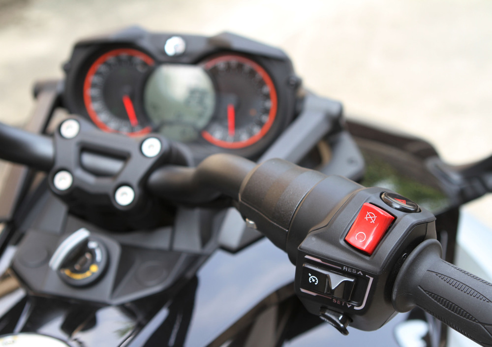 Molto più semplice il blocchetto destro, che ospita il pulsante di l’avviamento, l’interruttore di spegnimento d’emergenza, il cruise control e il pulsante del’hazard, che aziona contemporaneamente le 4 frecce. Per concludere con la logistica di bordo, dietro il blocchetto di avviamento spicca naturalmente il tappo in alluminio per rifornire il serbatoio da ben 27 litri, 4,5 dei quali di riserva.