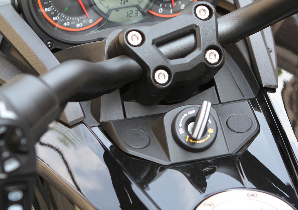 In entrambi i casi si guida di corpo e ovviamente di manubrio, ma la guida turistica richiede di accompagnare leggermente il veicolo spostando un po’ il corpo all’interno. Il comfort di bordo, nell’uso utilitario, è accentuato dall’assenza di vibrazioni e dalla dolcezza degli ammortizzatori Fox anteriori; il Sachs posteriore è un po’ più secco, ma lo si avverte più che altro sullo sconnesso un po’ marcato. Ovviamente, un pur piccolo parabrezza diverrà necessario per chi vorrà percorrere chilometraggi impegnativi, con lunghi tratti autostradali. Nella guida più tosta, da divertimento, ci si troverà invece a lottare letteralmente col torello meccanico (finché dura, perché dopo un po’ di chilometri di curve e controcurve le braccia si faranno sentire…), col busto all’interno e spingendo forte sulla pedana esterna alla curva, per tenerlo in traiettoria laddove invece lui voglia allargare, piuttosto che a cercare il sovrasterzo giocando col gas, con la ruota anteriore interna che tende a sollevarsi di pochi centimetri nelle curve strette, nei tornanti, nelle appetitose rotonde. Naturalmente, più si guida con decisione, mettendo alla frusta il mezzo, più è importante l’aiuto dello sterzo, anche a livello di sforzo fisico.