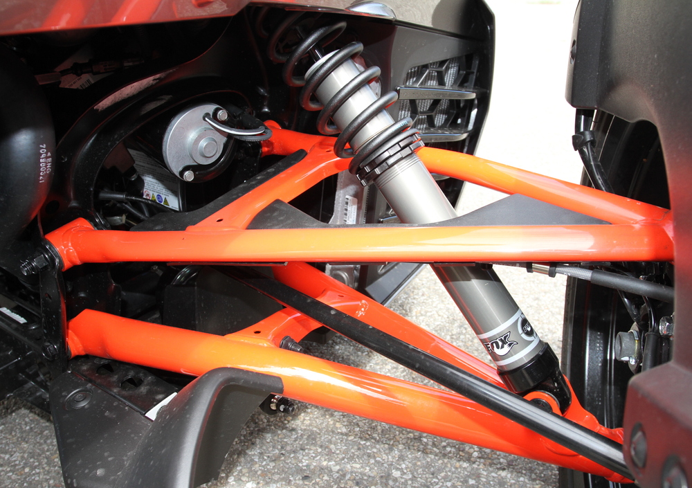 A gestire l’avantreno il manubrio che, asservito da servosterzo dinamico elettronico, controlla una struttura di tipo automobilistico denominata A-arm, con barra anti-ribaltamento, asservita da ammortizzatori Fox in alluminio, con escursione ruote di 129 mm, comuni agli Spyder F3. L’ammortizzatore posteriore invece è un Sachs, con escursione di 132,4 mm. L’elettronica di bordo vanta anche un sofisticato sistema di controllo della stabilità, in grado di rilevare la direzione presa dal pilota determinando la corretta reazione del veicolo: l’elettronica interviene su ciascuna ruota indipendentemente, e/o riduce ad hoc la coppia motrice fino a correggere la possibile perdita di controllo.