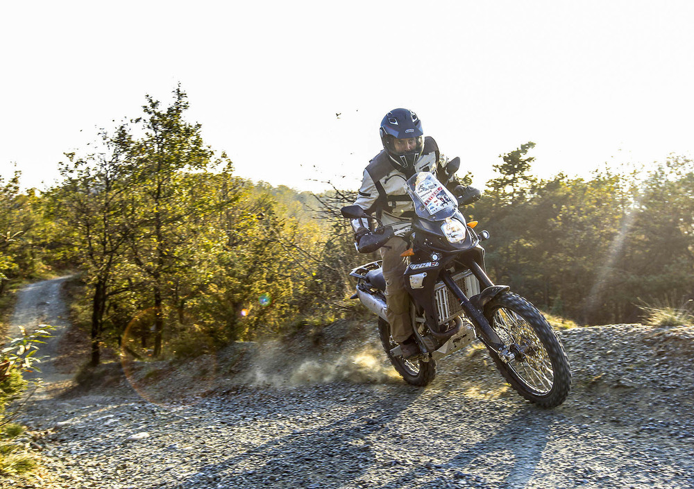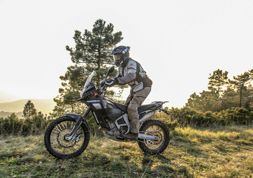 Dove invece non ce ne per nessuno, e la CCM GP450 A fa la differenza, è quando si poggiano i pneumatici fuori dalle strade asfaltate. Qui emergono in maniera lampante sia le dimensioni che il peso contenuti, oltre a un bilanciamento eccellente, forte di un baricentro basso e di masse volutamente centralizzate. Le caratteristiche di quest’AdvenTouring consentono di affrontare percorsi, che al solo parlarne i possessori di maxi enduro agghindate di tutto punto e pronte a ogni evenienza, almeno sulla carta, diventerebbero dei provetti sbandieratori di vessilli bianchi degni del Palio di Siena. Le sospensioni e la leggerezza permettono di affrontare senza paturnie gli sterrati più impegnativi e le mulattiere più scoscese con il minimo dell’impegno psicofisico, e poi se si sono fatti male i conti … tornare indietro non è un problema, almeno per lei, ci si gira in un fazzoletto e via andare. Il motore, reso più docile rispetto all’unità da cui deriva, è perfetto per questa moto, piccolo e compatto, ha potenza e coppia a sufficienza, e un’erogazione perfetta per trarsi d’impaccio in ogni situazione.