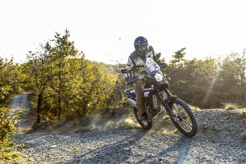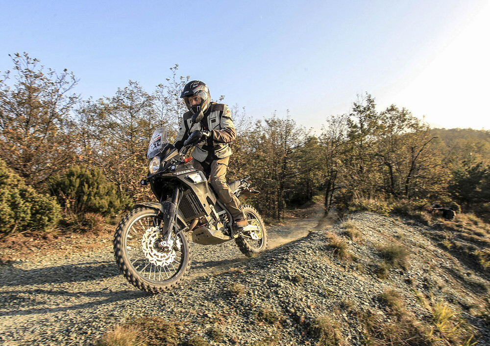 Esteticamente la CCM GP450 A colpisce per le dimensioni compatte e le forme snelle, i materiali plastici della nostra moto non sono ancora definitivi (trattasi di un esemplare pre-serie), così come le verniciature degli elementi in alluminio, ma il complesso appare curato, almeno dal punto di vista tecnico. Piccole modifiche riguarderanno anche la strumentazione digitale e alcuni particolari elettrici, ma i contenuti di questa moto sono altri e sin dai primi chilometri appaiono evidenti. Cerchiamo di non partire con il piede sbagliato, e cioè giudicando la GP450 A rimembrando precedenti esperienze in sella alle maxi enduro attuali. Qui il discorso è diverso e si percepisce dalle vibrazioni trasmesse dai “tassellati” montati per l’occasione, e dalla sella, più ampia di quella di una moto da enduro classica ma lontana dalle poltrone delle “endurone stradali”. Le prestazioni del monocilindrico quattro valvole sono allineate alle caratteristiche stradali della GP450 A, e cioè meglio prendersela con calma e senza fretta (per chi ne avesse meglio adottare la mappatura da 50 cv), anche in virtù di una rapportatura del cambio piuttosto corta. Ciò non toglie che con un paio di pneumatici più adeguati, l’inglesina sarebbe in grado di macinare strada asfaltata in tutta tranquillità, senza sacrifici particolari, potendo anche azzardare lunghi trasferimenti autostradali a velocità codice (la massima è indicata in 145 km/h). I freni a un primo sguardo sembrano quasi esagerati, in particolare il disco da 320 mm con pinza Brembo a doppio pistoncino (dietro c’è un più tranquillo 220 mm con pinza a singolo pistoncino), bisogna però tenere conto del fatto che con questa moto ci si può viaggiare in coppia, e con bagagli annessi, e che quindi big is better (grande è meglio!).