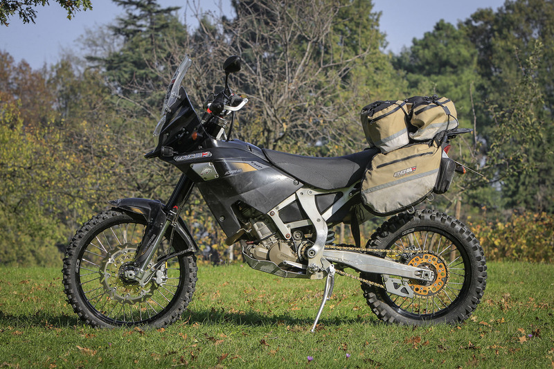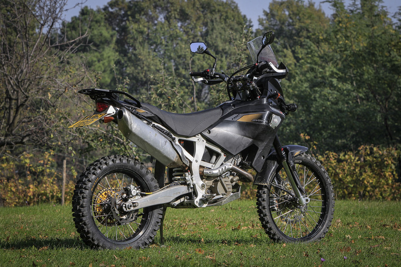 Il reparto sospensioni è affidato a una forcella Marzocchi Shiver a steli rovesciati da 45 mm, con una corsa utile di 270 mm, totalmente regolabile nel precarico, estensione e compressione, e piastre di sterzo in alluminio ricavate dal pieno. Dietro è stato adottato un mono-ammortizzatore Tractive (che per chi non lo sapesse è un’azienda olandese nata da una costola della WP), anch’esso totalmente regolabile (in compressione ha la doppia regolazione alte/basse velocità), con una corsa utile di 270 mm. Ruote e pneumatici sono da vera fuoristrada, i cerchi disegnati direttamente dalla CCM (così come i mozzi in alluminio ricavati dal pieno), sono gommati 90/90-21 anteriore e 120/90-18 posteriore. Anche l’assetto è da vera fuoristrada, l’altezza della sella è di 890 mm (è prevista anche una sella rialzata a 950). A richiesta si può avere anche una GP450 A con assetto ribassato, grazie a una minore escursione delle sospensioni, con altezza della seduta limitata a 790 mm.