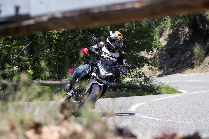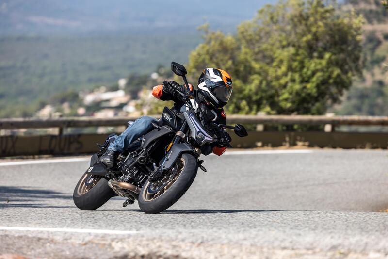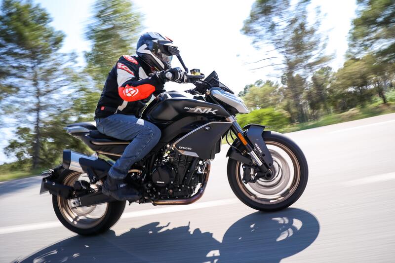 Accogliente fin da subito: il lavoro fatto sull'ergonomia è ottimo perché la posizione di guida è meno sportiva della 790 Duke– cui, per forza di cose, la stessa CFMOTO paragona la propria naked – con pedane appena più basse e avanzate e manubrio un pelo più alto. Le gambe si inseriscono magnificamente nella snella giunzione tra sella e serbatoio, i comandi razionalmente disposti mettono a proprio agio e viene immediatamente voglia di girare la chiave e iniziare ad andare: fin dai primissimi metri la 800NK si dimostra maneggevole, comunicativa e facilmente interpretabile, anche da spenta la si sposta senza patemi grazie al peso contenuto e alla facilità con la quale è possibile poggiare i piedi a terra anche da parte di chi non è un gigante, ma è nel suo habitat naturale che mette in mostra le sue migliori qualità.