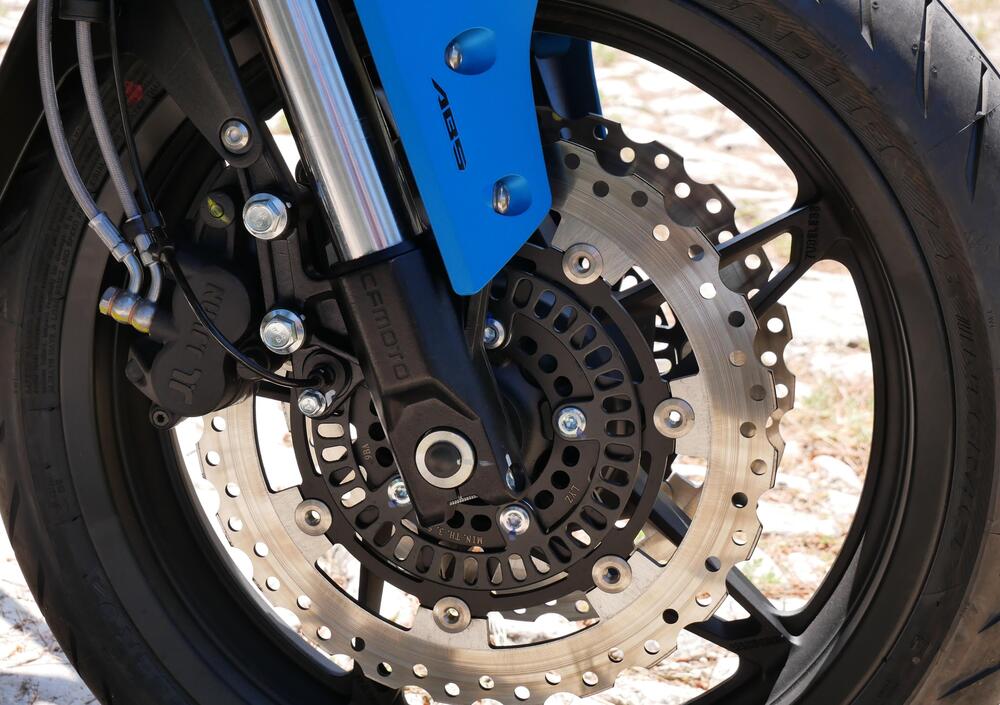 La MT 650 è ottimamente supportata da una forcella a steli rovesciati da 43 mm di diametro marchiata CFMOTO, regolabile in compressione su entrambi gli steli. Solida e controllata, a mio avviso è uno dei perni del buon comportamento dinamico della crossover cinese. Al retrotreno è presente un monoammortizzatore che agisce senza leveraggi, regolabile in precarico e compressione. Tarature - per entrambe le unità - di compromesso ma con un occhio al comfort.