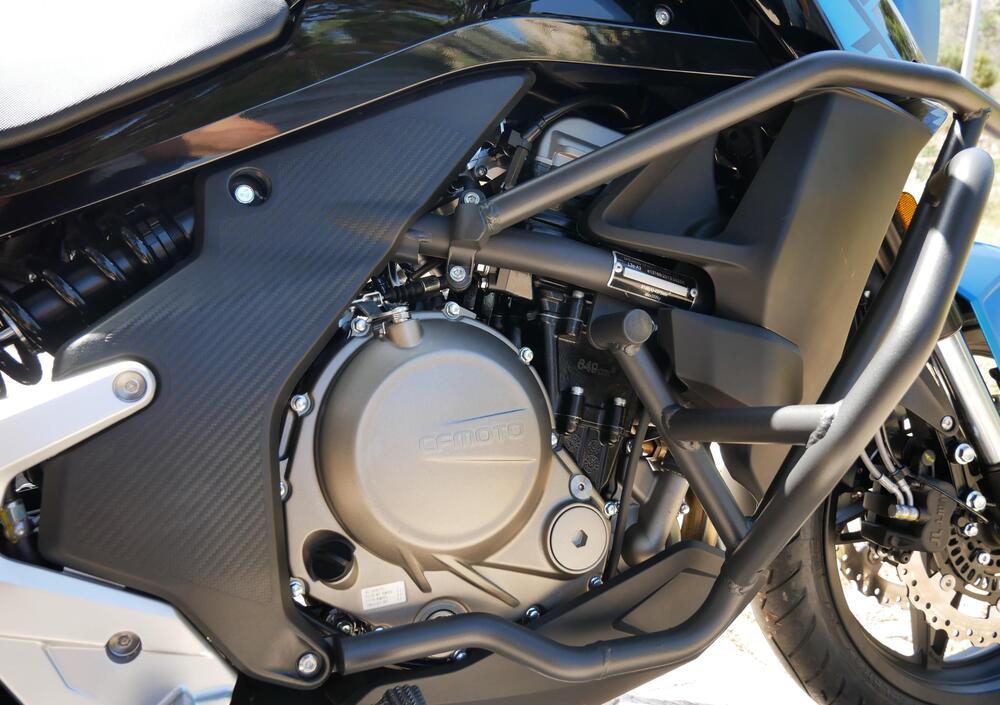 Il bicilindrico parallelo di 650 cc, quattro valvole per cilindro e a iniezione elettronica Bosch (omologato Euro4), ha dei tratti comuni con altre unità di pari cilindrata ma è prodotto da CFMOTO per la sua piattaforma di 650 cc. La potenza registrata sul libretto di circolazione è di 45 kW (61 CV) a 8750 giri, mentre la coppia è dichiarata in 62 Nm a 7000 giri. È presente la possibilità di scegliere una delle due mappe motore disponibili (Sport o Touring) che, dichiara CFMOTO, dovrebbero avere riflessi differenti sui consumi: se proprio devo essere sincero non ho notato praticamente alcuna differenza passando dall'una all'altra né in termini di prestazioni di punta, né in termini di erogazione, ma attendo smentite magari suffragate da rilievi strumentali.