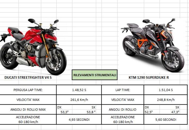 Tutto questo premesso, partiamo in ordine di tempi: la Ducati Streetfigher V4S ferma il crono in un notevolissimo 1'48"52, arrivando in fondo al rettilineo a 261,6 Km/h. Impressionanti, per una naked, gli angoli di piega, 53,3° a destra e 53,8° a sinistra (in teoria il lato più "freddo" delle gomme, a Pergusa), e ancora di più l'accelerazione in sesta marcia tra 60 e 180 Km/h di 4",93!