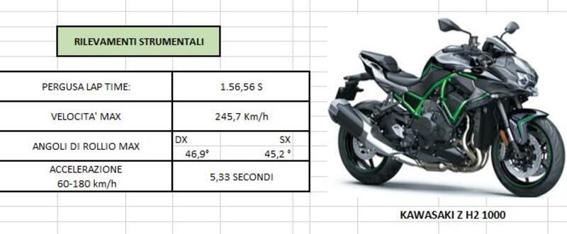 Ultima nei tempi sul giro, ma le sue pretese in pista non sono - dichiaratamente - pari a quelle di altre Hypernaked, la Kawasaki Z H2. Pesano l'assetto, i freni e l'elettronica più stradali del lotto, oltre ad una massa più avvertibile rispetto alle concorrenti: la Z H2 non vuole essere la regina dei cordoli quanto una naked stradale dalle prestazioni elevatissime e così stacca un 1'56"56 con una velocità massima di 245,7 Km/h che contrastano però con una capacità di portare da 60 a 180 Km/h la moto in soli 5"33, il secondo risultato assoluto della comparativa nonostante il peso più elevato! Anche gli angoli di rollio confermano un'attitudine meno pistaiola: con 46,9° e 45,2° sono i meno... inclinati tra quelli rilevati.