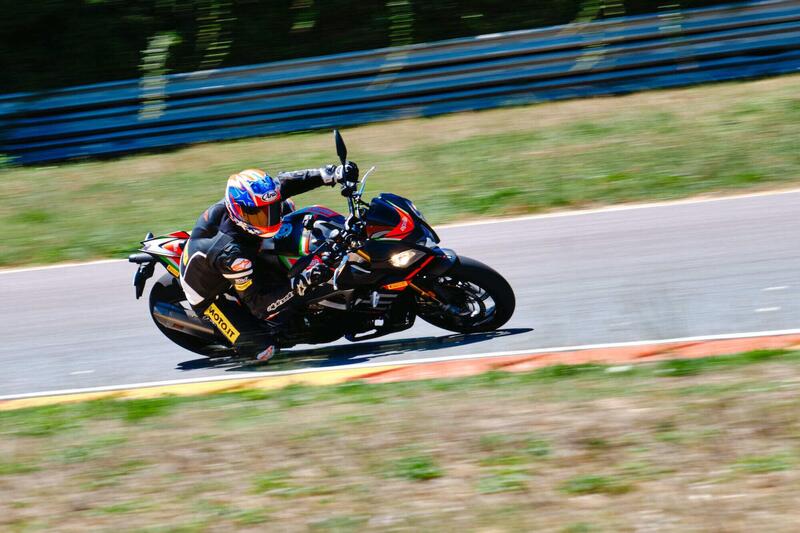 Quella posizione di guida che su strada la penalizza un po’ la esalta invece in pista: è quella più corretta e azzeccata fra i cordoli, asseconda gli spostamenti del corpo e consente di non aggrapparsi al manubrio, a tutto favore della scorrevolezza a centro curva e della… possibilità di tirarle il collo in uscita. E poi, la solidità della ciclistica e l’efficacia delle sospensioni Ohlins semiattive con interfaccia OBTi fanno sì che si riesca a sfruttare il maggior grip offerto dalle slick Pirelli: basta sostenere un po’ l’idraulica nei tre frangenti e la Tuono diventa ancora più precisa, stabile e veloce in percorrenza, smorzando anche quei minimi ondeggiamenti nei cambi di direzione innescati dalla decisione degli input unita al maggior grip delle coperture.