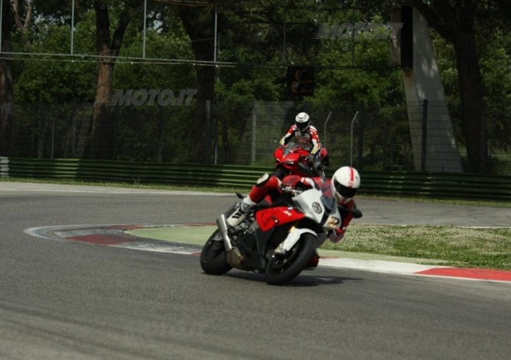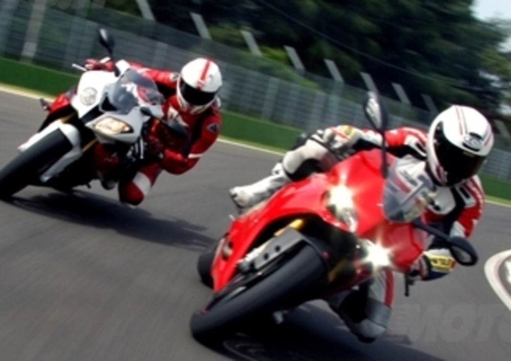 Impostazione corsaiola anche per la tedesca, che garantisce una maggiore protezione dall’aria e che mette sul piatto della bilancia un motore formidabile per potenza e allungo, con una serie di controlli elettronici che si rivelano partner ideali per sfruttarne le grandissime potenzialità. Più simile nel comportamento di guida alle quattro cilindri giapponesi, la S 1000 RR mette a proprio agio immediatamente con un avantreno stabile, ma non particolarmente svelto, e un posteriore con un ottimo grip e un controllo di trazione dal funzionamento ottimale. Il raggiungimento delle massime prestazioni appare più a portata di mano che non sulla Panigale, ma la sensazione “di non poter andare oltre”, di aver raggiunto il limite c’è. In sella alla rivale italiana si sente che più si spinge, più si osa, più lei va forte e ti asseconda.