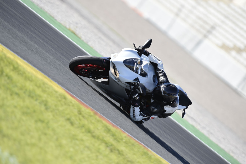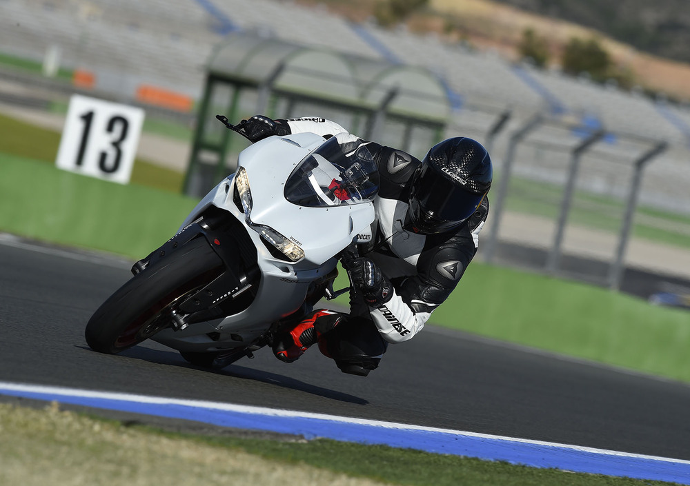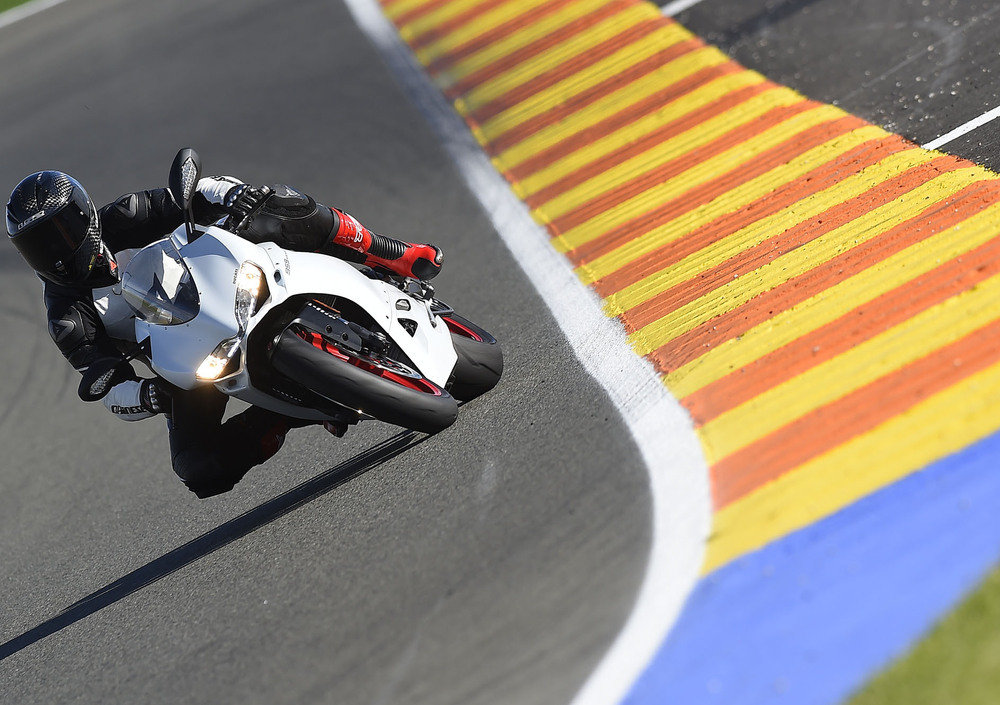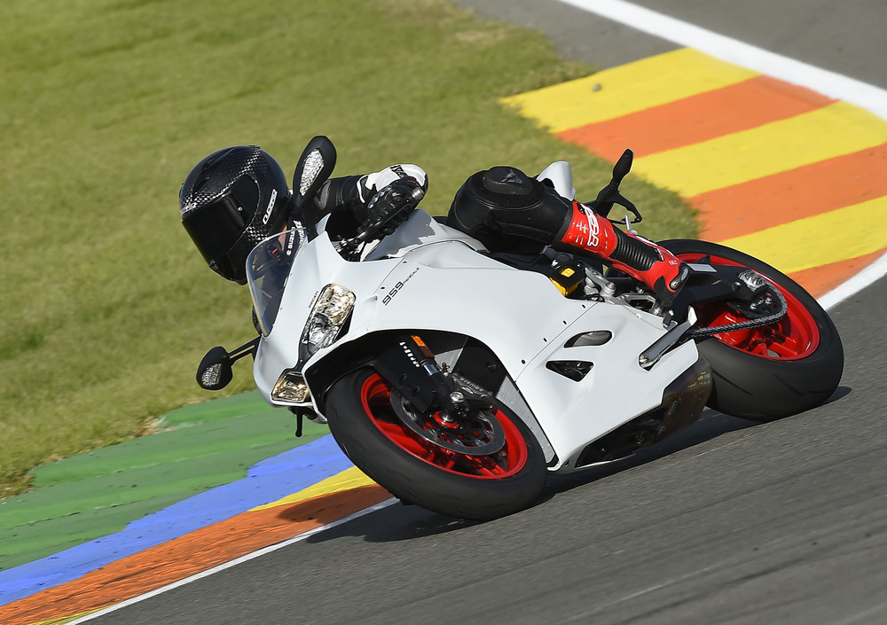 La maggiore spinta del motore rispetto alla 899 a partire dai medi regimi è tangibile, e la risposta del gas, mai sopra le righe o troppo brusca, permette di girare la manopola senza indugi, anche a moto ancora inclinata, come ci ha fatto vedere il collaudatore Ducati Alessandro Valia che si è divertito a strappare gomme e a dipingere lunghissime pennellate di nero su tutte le curve del tracciato. L’elettronica di pregio serve sia a tenere a bada eventuali gesti inconsulti, sia a rendere ancora più performante la 959 Panigale. Bilanciamento è il termine adatto a descriverla, il motore che spinge anche dove il vecchio 899 faticava un poco, il quickshifter che spara i rapporti uno in fila all’altro senza possibilità di errore, il freno motore regolabile che grazie al nuovo sistema antisaltellamento rende le fasi di staccata precise e con traiettorie millimetriche, e i freni potenti e modulabili e mai aggressivi. Un pacchetto tecnologico e dinamico davvero riuscito, un equilibrio che ci ha conquistato e che ci ha convinto pienamente.