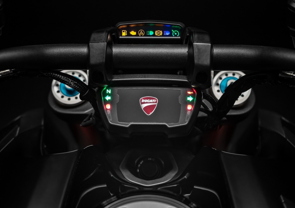 Fra le novità – ma anche sulla versione 1260 standard – arriva anche un bellissimo cruscotto con pannello TFT a colori (precedentemente era in b/n) posizionato sotto il manubrio che fa il paio, come tradizione sul Diavel, con il blocchetto spie separato collocato sopra il manubrio, nella posizione in cui normalmente ci si aspetta di trovare la strumentazione.