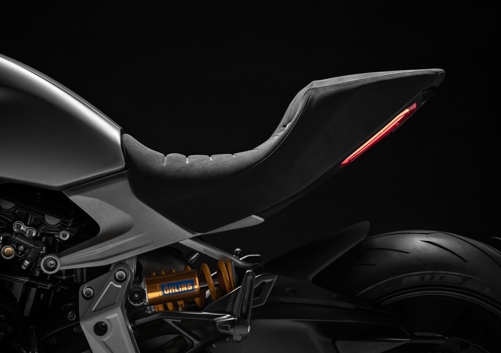 Naturalmente mantenuta anche la funzionalità di accensione keyless, ormai diventata di adozione comune sulle Ducati stradali di alta gamma, e l'altra caratteristica particolare del Diavel, ovvero il maniglione posteriore a scomparsa. E restando in zona, vale la pena di segnalare selle più ampie e confortevoli sia per il passeggero che per il pilota.
