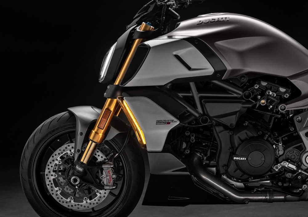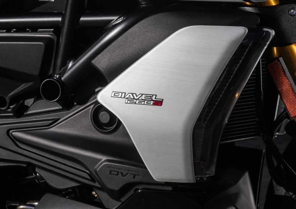 Cambia il colpo d’occhio sul serbatoio, stretto da due cover dal (completamente) diverso andamento stilistico che confluiscono in prese d’aria in alluminio spazzolato su cui campeggia il nome del modello. E sono diversi anche i coperchi laterali del radiatore, che integrano gli indicatori di direzione light blade, evoluti nella linea e nell’andamento. Proprio la firma ottica, tra l’altro, è stata fin dall’inizio una delle caratteristiche più interessanti del Diavel, con l'unità posteriore sdoppiata che riprende lo schema dei lampeggiatori. Sul modello 2019 del Diavel 1260 S i gruppi ottici sono Full LED, con un sensore che alterna automaticamente la luce diurna (con disegno a omega che incornicia il faro anteriore) e quella notturna.