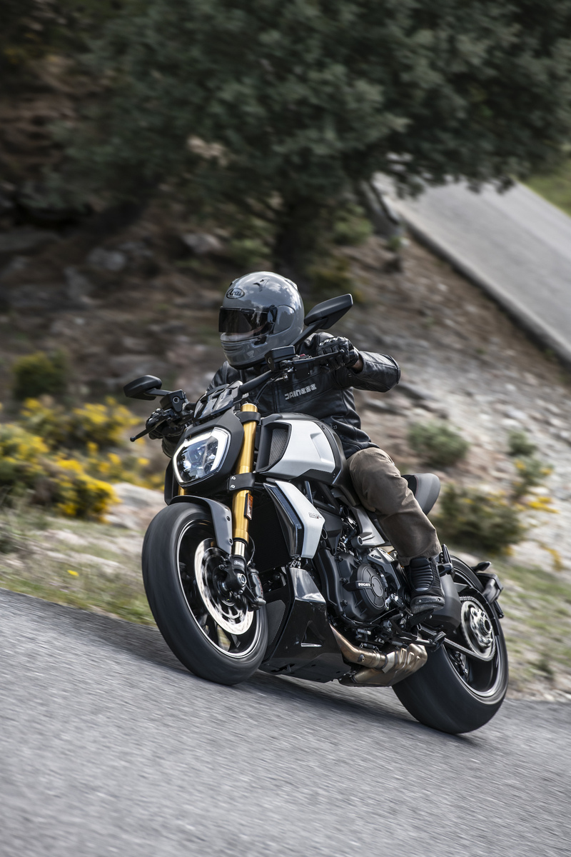 Importante naturalmente l’interasse (1.600mm, ovvero 10 in più del precedente) che fa però il paio con quote ciclistiche decisamente meno conservative: il cannotto di sterzo è inclinato di 27° (un grado in meno rispetto al precedente Diavel) e l’avancorsa ora è di 120mm contro i 130 precedenti. Come mai l'interasse cresce a fronte di un avantreno più chiuso e di un forcellone più corto? Per un diverso posizionamento del motore, che arretra per fare spazio ai radiatori di acqua e olio, ora in posizione convenzionale invece che laterali come sul Diavel precedente.