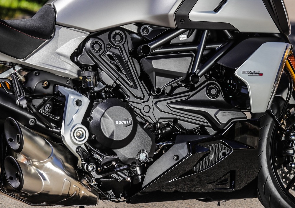 Caratterizzato da un sistema a doppia accensione Dual Spark (soluzione utilizzata già da tempo in Ducati, visto che ha debuttato sul Desmodue da 1.000cc di Monster e Multistrada) il motore del Diavel è anche dotato di iniezione di aria secondaria allo scarico per ridurre le emissioni senza penalizzare l’erogazione. L’alimentazione è affidata a un impianto Ride-by-Wire Bosch con corpi farfallati ellittici di diametro equivalente a 56 mm, mentre lo scarico è stato completamente rivoluzionato: il giro dei collettori sul lato destro, poi mutuato anche dalla gamma Monster, ha ceduto il posto a un passaggio nascosto che lascia il motore completamente in vista, con terminali di scarico “imboscati” quasi quanto quelli della prima Panigale…