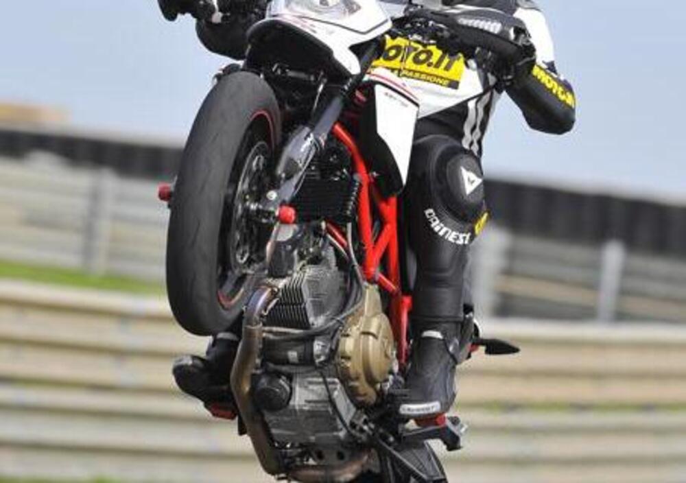 La EVO SP attraversa la corsia dei box con un rumore pieno e cupo (merito dello scarico singolo Termignoni, optional montato sulla moto in prova insieme alla centralina rimappata). Il grosso desmo a 2 valvole per cilindro gira regolare già ai bassi regimi, ma basta inserire la seconda e girare il polso destro per sentire la moto schizzare in avanti con il corto parafango anteriore che punta deciso il cielo. Inseriamo la terza, ma la Hypermotard SP non vuole saperne di tenere il muso a terra. Avevano ragione i tecnici della Ducati: questa Hyper, grazie anche alle sospensioni a lunga escursione e al manubrio rialzato, ricorda in tutto e per tutto una Supermoto da competizione!