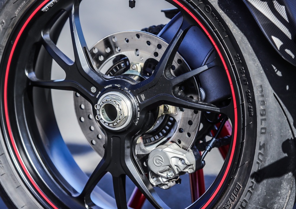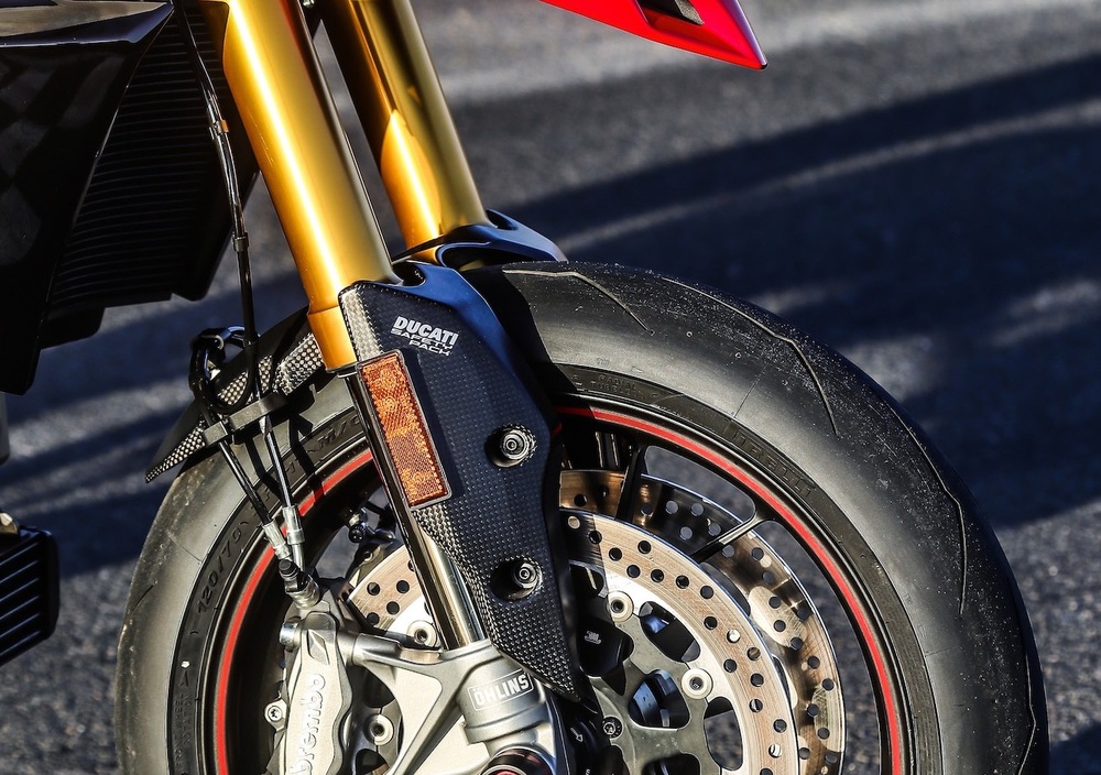 L’impianto frenante anteriore è caratterizzato da una coppia di pinze radiali monoblocco M4.32 Brembo a 4 pistoncini con dischi da 320 mm e flange in alluminio (che hanno permesso un risparmio totale di 600 grammi), mentre al posteriore troviamo un singolo disco da 245 mm. I cerchi in alluminio con 3 razze a Y con sezione da 3,5’’ davanti e 5,5’’ sono gommati Pirelli Diablo Rosso III (120/70 all’anteriore e 180/55 al posteriore), più leggeri di 800 grammi rispetto a quelle del 939 sulla Hypermotard 950, cedono il passo a leggerissime unità Marchesini forgiate con 3 razze a Y con sezione da 3,5’’ davanti e 5,5’’ dietro con Pirelli Diablo Supercorsa SP v3 sulla Hypermotard 950SP.
