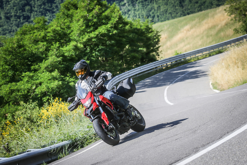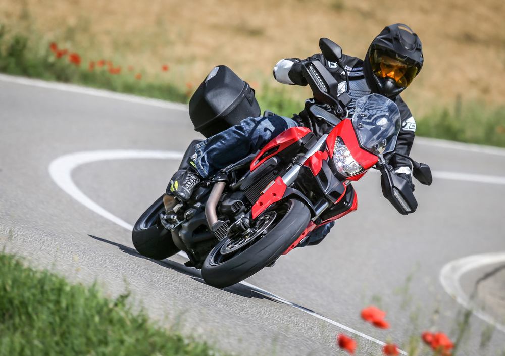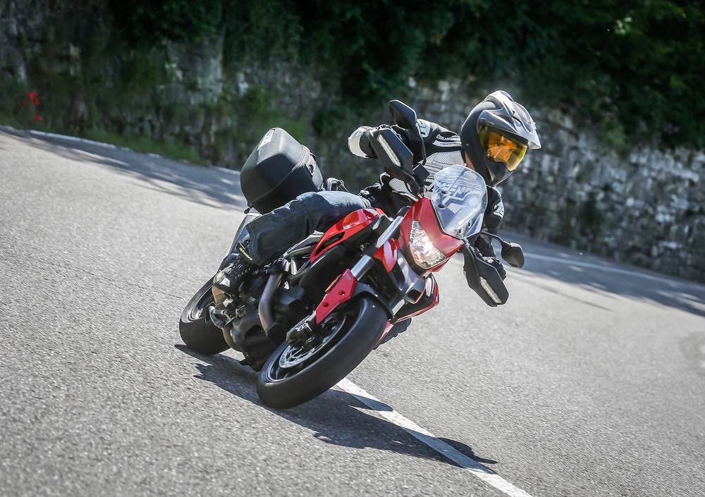 Le sospensioni sembrano più coerenti nel comportamento rispetto alla Hypermotard, con una taratura generalmente più morbida – ma il mono resta proporzionalmente più rigido rispetto alla forcella – e una discreta scorrevolezza. La taratura più morbida rende però più facile toccare con cavalletto centrale e scarico in piega: non servono eroismi da Mondiale per sentire qualche parte fresarsi sull’asfalto, e se è vero che la sensazione è comunque gratificante, in caso di fondi un po’ dissestati il comportamento può rivelarsi pericoloso.