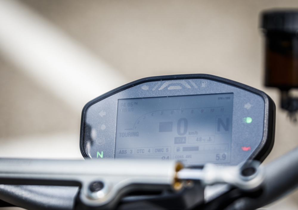 Ottima anche la modalità di controllo del cruscotto, che permette di gestire praticamente tutto con due pulsanti: intuitiva e rapida. Piacciono un po’ di meno i comandi di freno e frizione, dove spicca l’assenza della pompa radiale, e il cruscotto stesso è un po’ meno raffinato (e leggibile) della concorrenza.