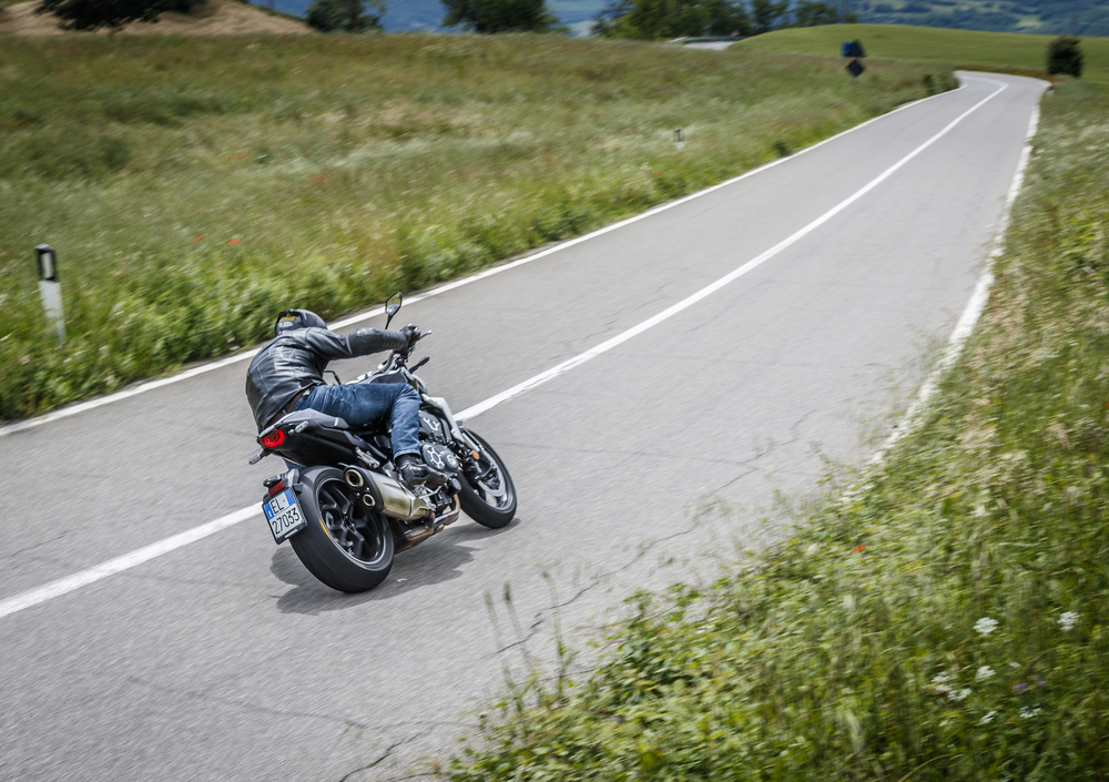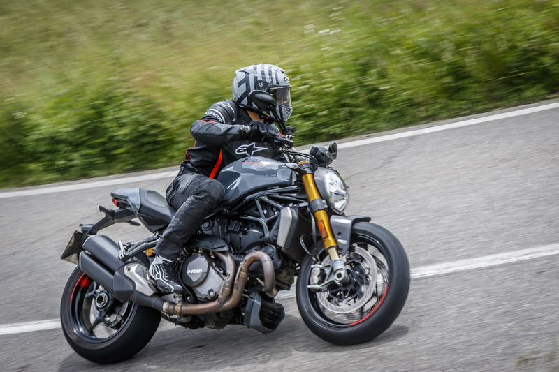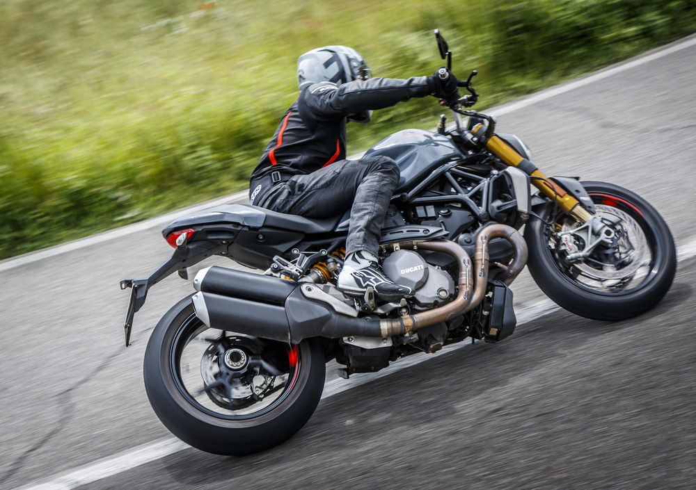 Il forcellone accorciato rende sensibilmente più svelta la naked Ducati, che continua a non avere nell’agilità la sua dote migliore ma si rivela stabile oltre ogni ragionevole dubbio. E poi alla naked Ducati bisogna prendere le misure, perché la ciclistica è sportiva ma tende a muoversi un po’ nella guida sportiva. Niente di pericoloso o preoccupante, è solo il modo del Monster di farvi sapere che state tenendo un ritmo interessante. Freni e sospensioni lavorano egregiamente quando li si sfrutta; nei cambi di direzione si deve lavorare un po’ più che sulle rivali, in compenso in percorrenza la fiducia sul davanti è praticamente assoluta. E quando le velocità si fanno… interessanti, la 1200 fila dritta come un fuso. E niente da dire sulle Pirelli Diablo Rosso 3, che si accordano bene alla ciclistica bolognese.