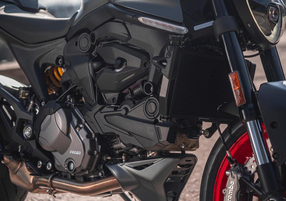 Il propulsore del nuovo Monster è il Testastretta 11° da 937 cc in versione Euro-5 in una versione che ha subito tantissime evoluzioni pensate specificamente per l'implementazione sul Monster - vi basti pensare alle teste in magnesio, unico dettaglio visibile dall'esterno, ma sotto la pelle sono cambiate bielle, pistoni, tamburo del cambio, frizione, alternatore, coperchi cinghie, oltre naturalmente ai sistemi di aspirazione e scarico. Più moderno e compatto rispetto all’821 che costituisce l’inevitabile termine di paragone, porta quindi in dote al Monster 2021 una maggior leggerezza (-2,6 chili) e un guadagno di 2 cavalli, con la potenza massima che sale a 111 cavalli a 9.250 giri.
