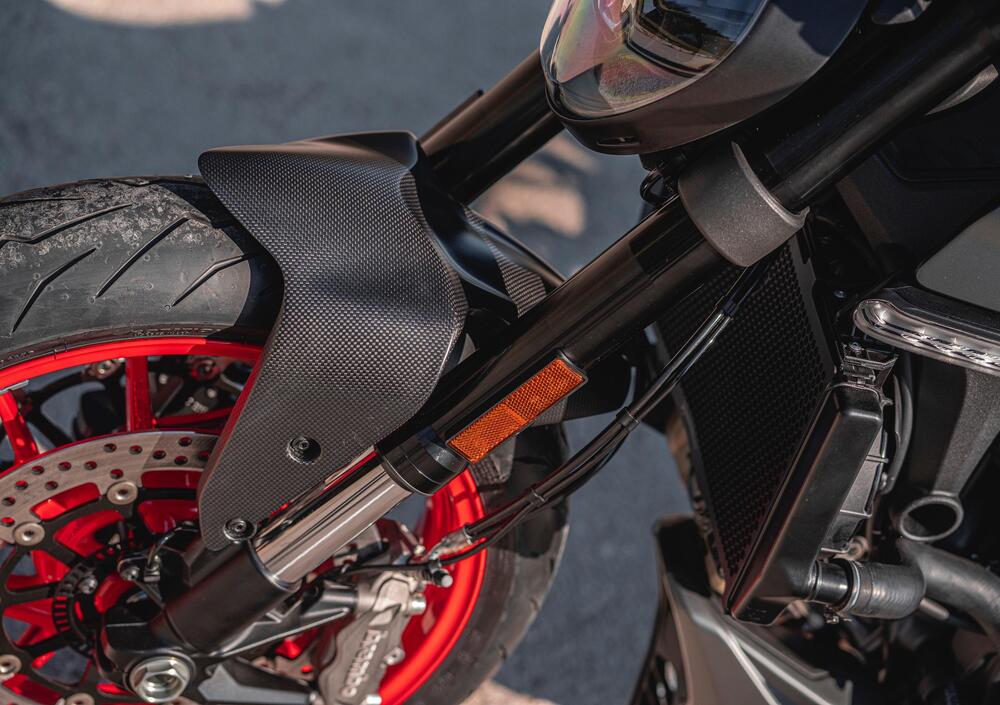 Il comparto sospensioni mantiene lo standard precedente: forcella a steli rovesciati da 43 mm, non regolabile, e monoammortizzatore regolabile in precarico ed estensione con schema cantilever. I cerchi sono unità da 17” calzanti Pirelli Diablo Rosso III nelle misure 120/70 e 180/55.
