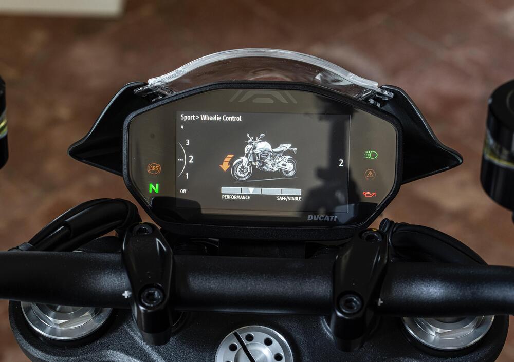 I riding mode sono ben tarati e nettamente differenziati: tra l’altro il più spinto - lo Sport - che tipicamente è divertente ma meno efficace - si rivela sì gustosissimo ma anche molto sfruttabile. Compresa la prima: se con il vecchio Monster, in movimento, vi fosse per caso entrato il primo rapporto, vi sareste trovati a gestire risposte quantomeno brusche. Con il Monster 2021 anche la prima, nei tornanti più stretti, diventa sfruttabile grazie a leggi d’apertura dell’acceleratore differenziate sui primi due rapporti (sul primo nel caso dello Sport, appunto). E anche spremendo il motore, la schiena si stempera bene nella spinta agli alti, spingendo forte fino a velocità decisamente incivili: difficile, su strada, sentirsi in difetto.