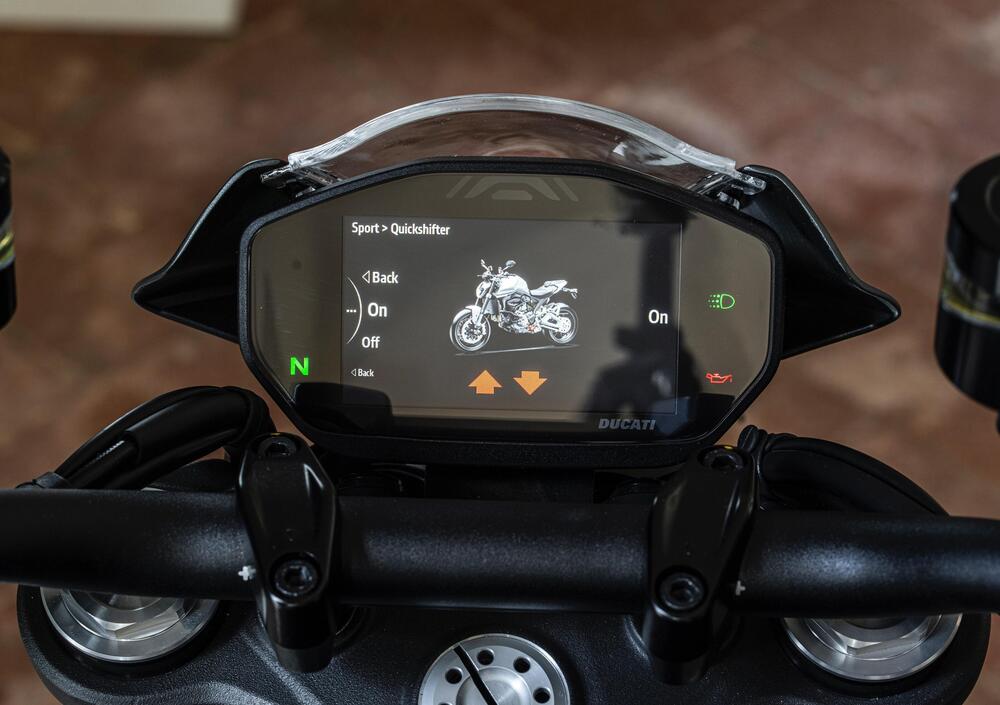 Ci si siede in sella e, chiudendo gli occhi, a motore spento non diremmo mai di essere in sella a un Monster. Al massimo a un Monster entrato in una macchina del tempo che l’ha sparato in avanti di vent’anni rispetto all’821 che conoscevamo. Più piccola, compatta, con una triangolazione più moderna - il manubrio è nettamente più vicino al pilota - e senza contatti fastidiosi sulle ginocchia per piloti di tutte le stature: le superfici sono state curate davvero bene, e dovunque si tocca la sensazione è estremamente piacevole. Il colpo d’occhio sul ponte di comando è davvero gratificante, il livello di qualità percepita è davvero molto elevato per la fascia di riferimento. I comandi sono tutti morbidi e precisi nell’azione, e il cruscotto è leggibile e bello, con un’interfaccia utente molto intuitiva. Le finiture, in generale, sono da riferimento per la categoria: dovunque si posi lo sguardo, anche andando a curiosare nelle zone nascoste, c’è davvero poco di fuori posto.