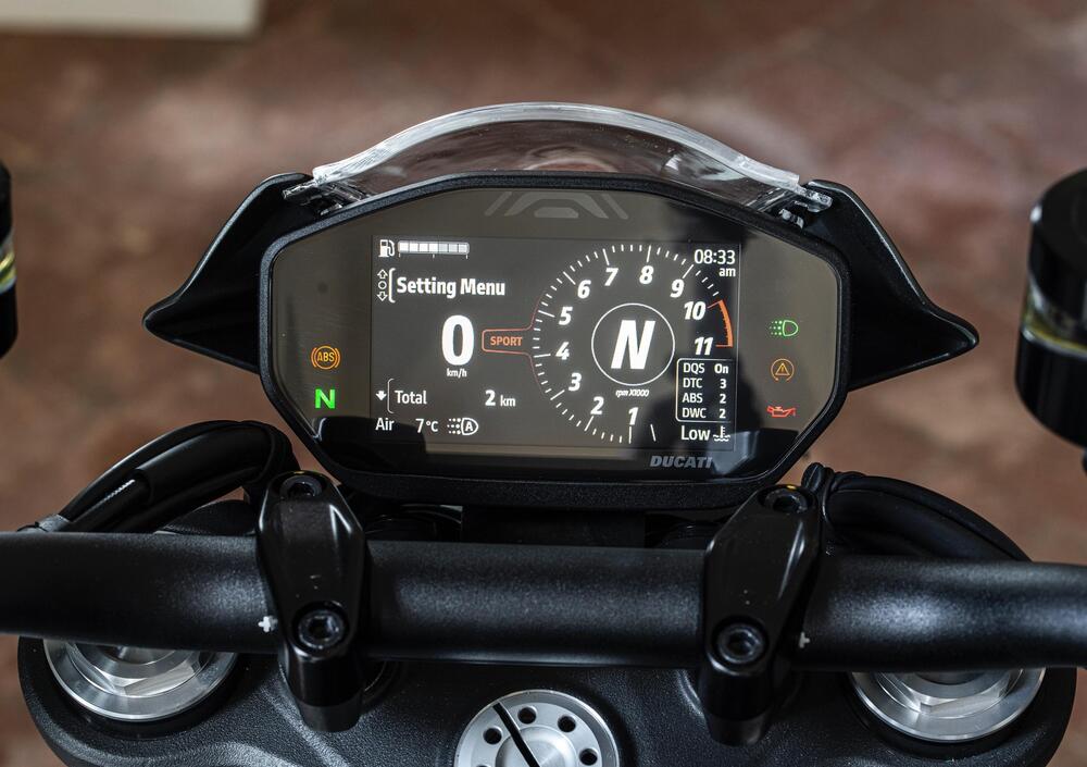 Altro salto in avanti nella gestione elettronica: il pacchetto elettronico della piattaforma 950 è stato aggiornato con l’arrivo della piattaforma inerziale, consentendo l’adozione dell’ABS cornering che va a completare una dotazione che comprende traction control DTC, controllo impennata DWC e Launch Control. Il tutto viene gestito da un nuovo cruscotto TFT a colori da 4,3”, con autoswitching delle colorazioni giorno/notte, che richiama naturalmente le unità montate su Panigale e Streetfighter V4 (ma con la definizione grafica delle icone inaugurata con la Multistrada V4), e naturalmente predisposto per l’adozione del Ducati Multimedia System.